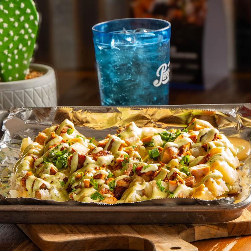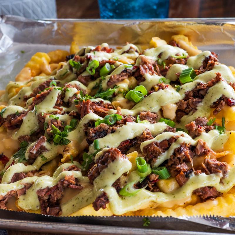 Crinkle-cut fries smothered in gouda cheese sauce topped with green onions, cilantro crema, and your choice of protein: chicken +$4.00 | pork +$5.00 | brisket +$6.00